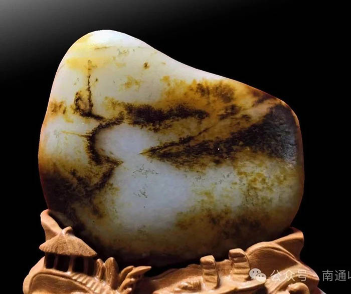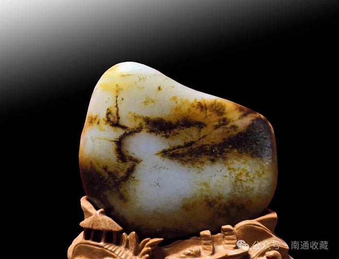 我喜愛的一塊新玉是一個籽料原石。十多年前,我在朋友宴請之余,無聊時在一藏友發的朋友圈中看中這塊玉的。這不僅是和田籽料,同時也是畫面玉。玉面天然和田風光,玉龍河晨光普照,岸邊胡楊枯黃。一幅中國畫,一幅天然的中國畫!玉是和田料,畫是和田風光。好玉隨緣,我收下上天所賜,愛不釋手。