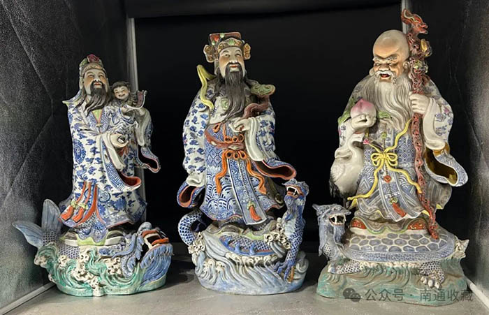 這個做師傅的鏟地皮人,確實不僅會講故事,而且還會做套子。一次他邀請我去鏟地皮,言下之意,你不懂鏟地皮,就不能真正學會玩古玩。在他的眼中,拿行里(古董商人)貨的人,不是真正的古玩家。他帶我來到一個水鄉古鎮,古鎮很繁華,街面上有理發的、做豆腐的、爆米花的、炸油果子的。我們七拐八拐到了一戶人家,走進廚房,里面有一個老人在煮飯。老人也沒空理我們,鏟地皮的東看看,西看看,最后尋到三只福祿壽三仙瓷器。這瓷器說老不老,說新不新,大概就是民國期的物件。但是在他的嘴里夸的是天花亂墜,說這件如何如何的好,后來我懷疑是他埋的坑。
