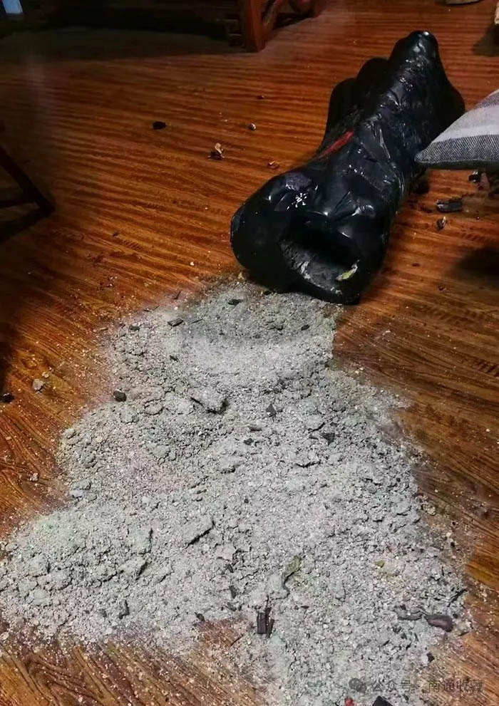 次日,好友電話告訴我,木頭是小葉紫檀,油性好,只是外皮做了舊。俗話說“十檀九空”,做舊的人用水泥漿塞滿空洞,清理的水泥足有十四斤多。原來不是大師看不懂,是份量不對,攪亂了大師的判斷。這個劈開的小葉紫檀,我請好友以大化小,制作了多件精美的藝術品。
