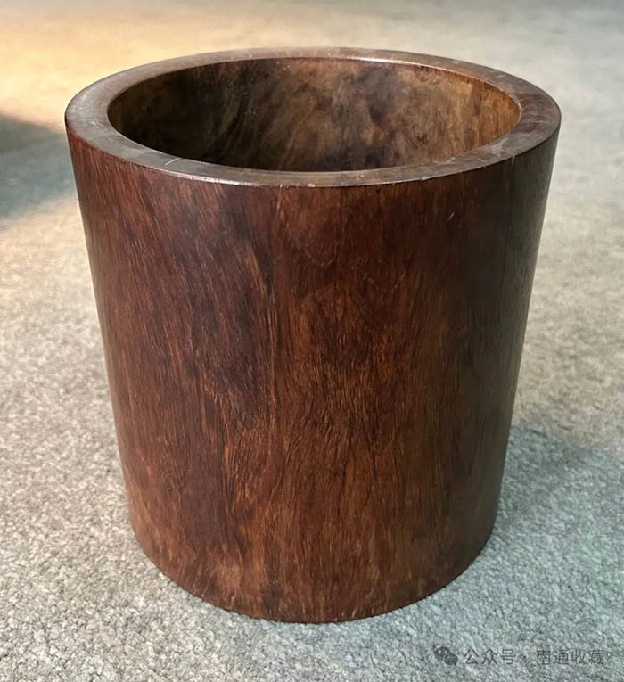 筆海是文房用具中的一種,筆海之名取其口徑很大之意。這筆海回來后,好多人不認同。一不是老貨,二不是紫檀。本地曲塘有一個資深的古董商強烈表示,這不是小葉紫檀,是非州紫檀。這小子識寶水平還是有的。我的老師劉化北曾經說過,此人水平不在他之下,但是心術不正。其實,老師說得不錯,他們都是唯利是圖,而且同行間一定是互相踩踏。這木料是不是真正的小葉紫檀,我也是一頭霧水。